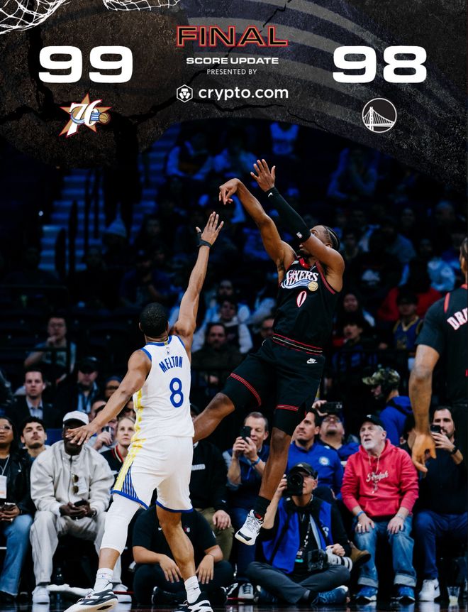 勇士也没有暂停,但他们也完成了一个精妙的长传,健康的梅尔顿速度很快,但马克西从后面冲上来完成了决胜封盖,这个封盖后费城主场沸腾了,全都在为马克西、埃奇库姆欢呼。