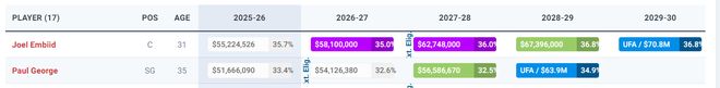 恩比德未来五年合同2.43亿,乔治四年合同2.12亿,这两人都是打打停停,费城更衣室也都以马克西为领袖,那么这4.55亿的双巨头实际上就是可以被交易的,以双答案建队实际上更好。